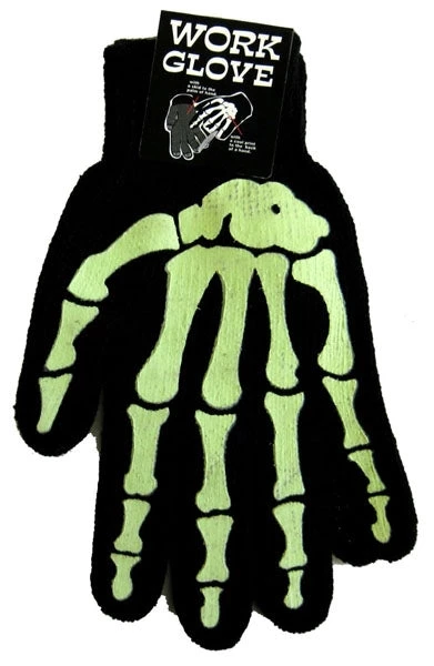 Stay warm with these glow-in-the-dark skeleton bone printed men’s sizing classic work gloves with grips on the palms for extra durability!