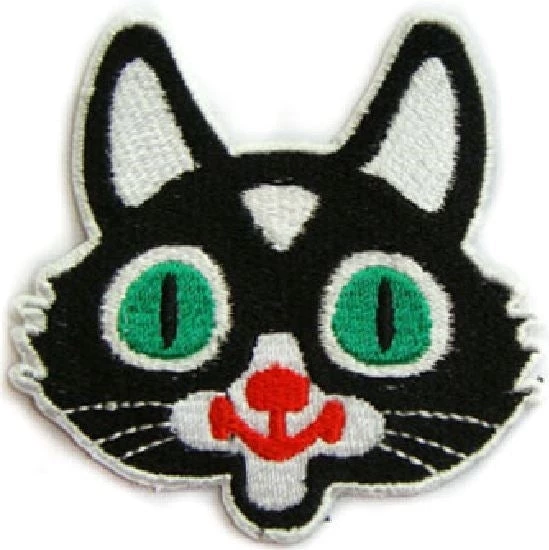 What’s goin’ on in that crazy cat brain!? Cute green-eyed black & white tuxedo cat face embroidered patch, made by Hollywood Mirror