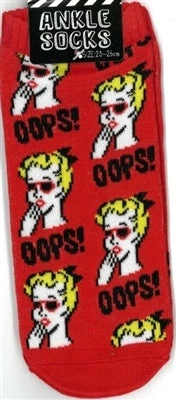 Soft & cozy little red ankle socks with allover “OOPS!” & retro blond-haired gal face print