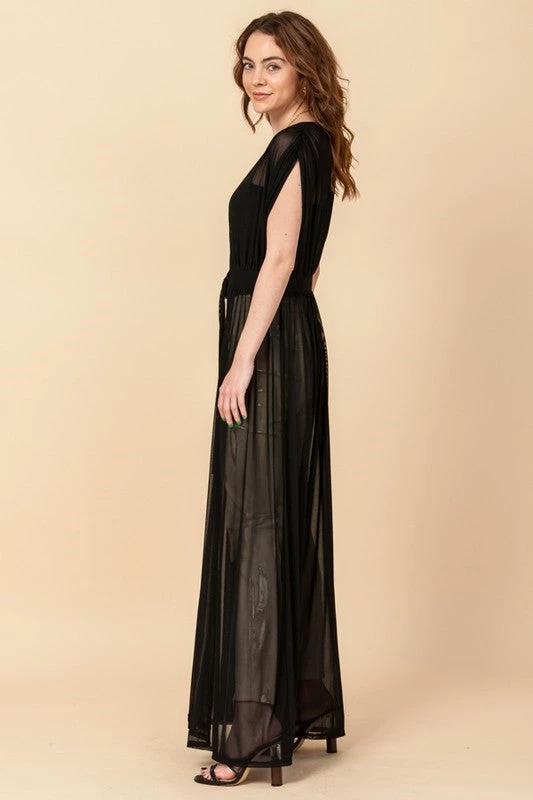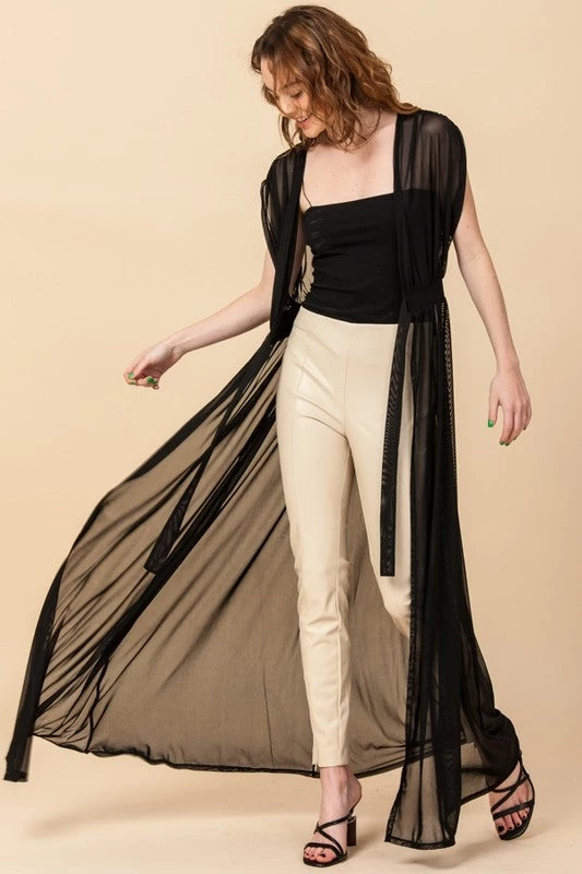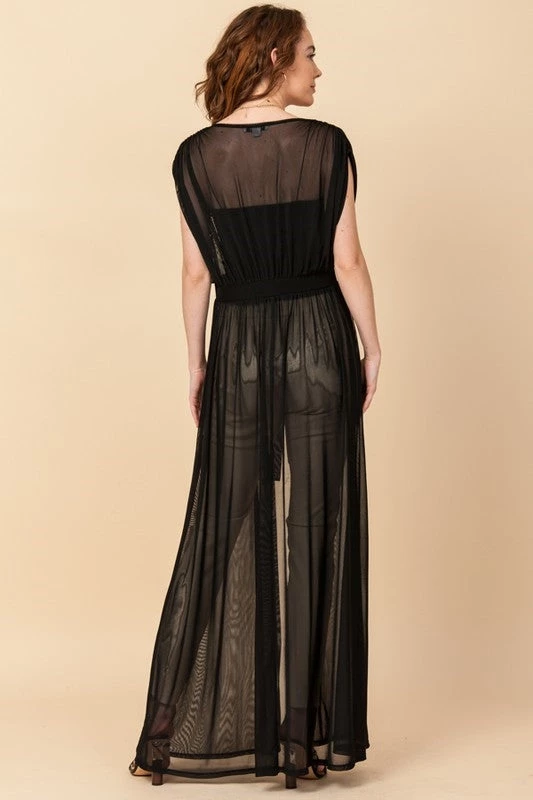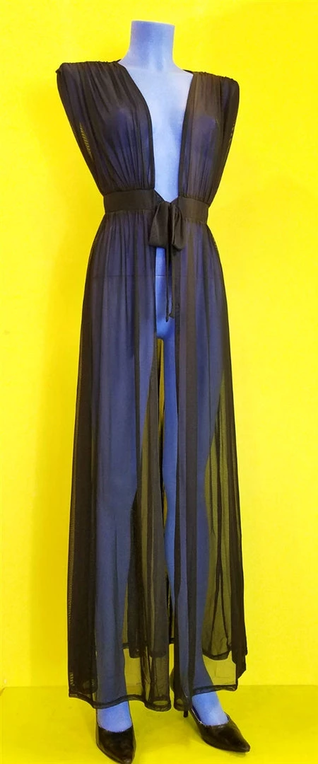 Soft & stretchy sheer black mesh sleeveless maxi length robe with 1 1/2″ wide elastic waistband and self tie-front closure –this dramatic and versatile piece will be a great cover-up layer for swim, glam ensembles, or just lounging at home, maybe while eating bon bons…;)