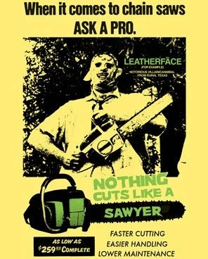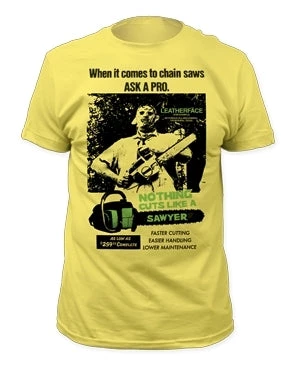 Texas Chainsaw Massacre screenprint on a banana yellow guy’s sizing fitted t-shirt