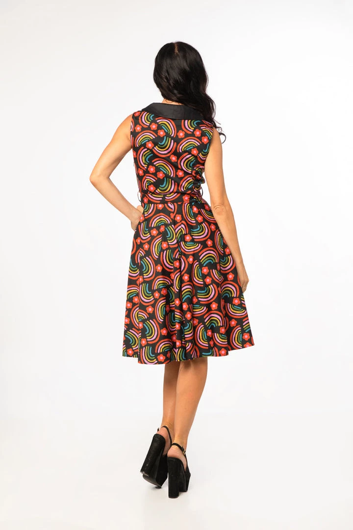 “Rainbows” black background with allover sweet rainbows and flowers print dress from Miss Lulo –this sleeveless shirtwaist beauty features a fitted shawl collar button-front bodice, removable self belt with buckle, flared just below the knee length skirt…and pockets!