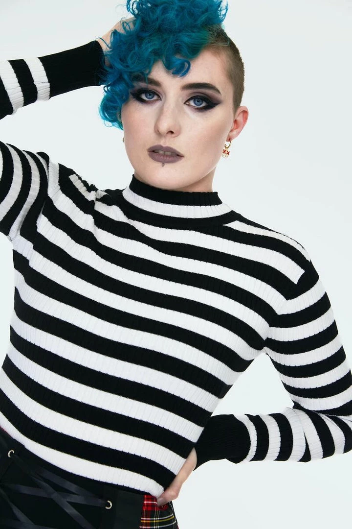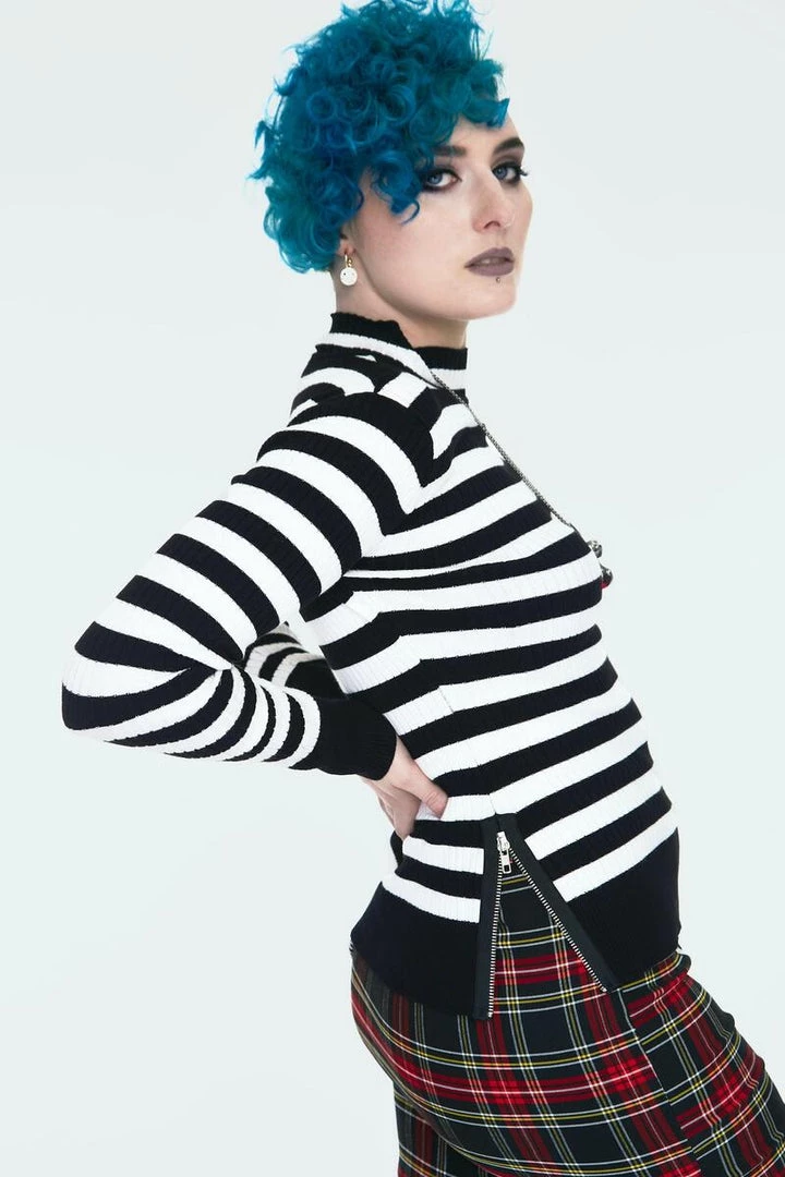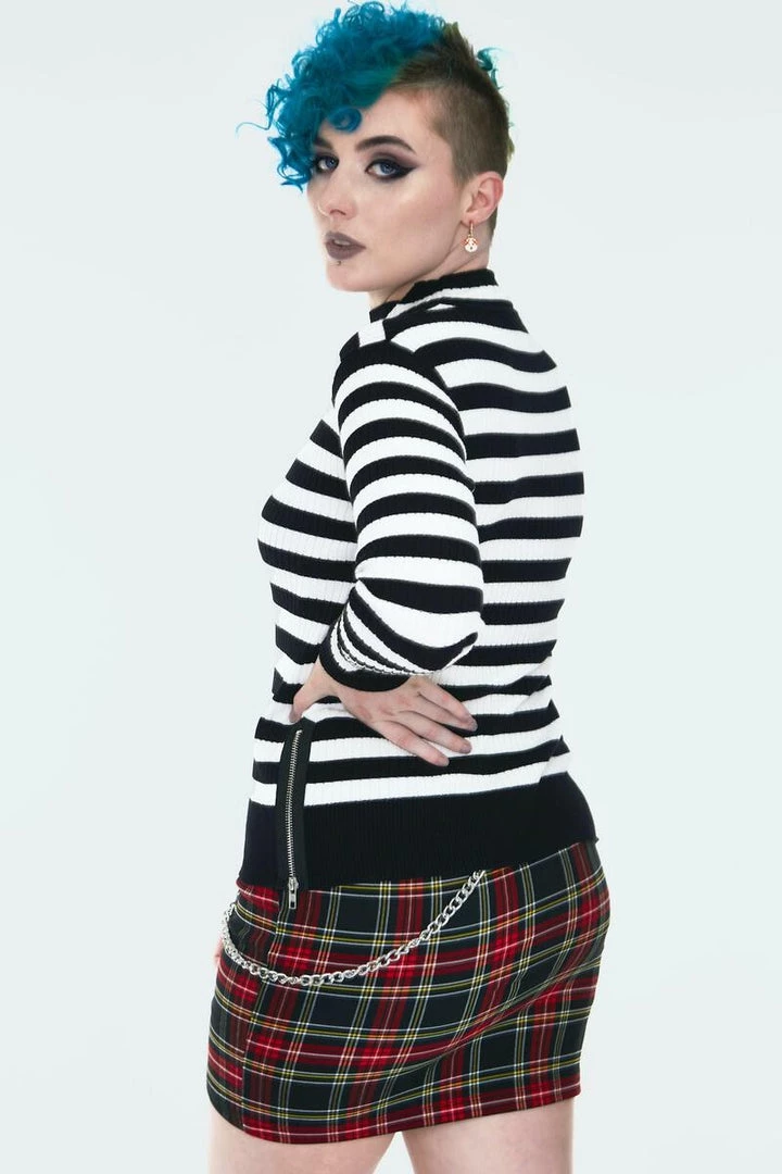 Fitted mock turtleneck long sleeve wide rib sweater in black & white stripe pattern with ribbed knit black band at cuffs and bottom hem, and featuring silver metal side seam zippers.