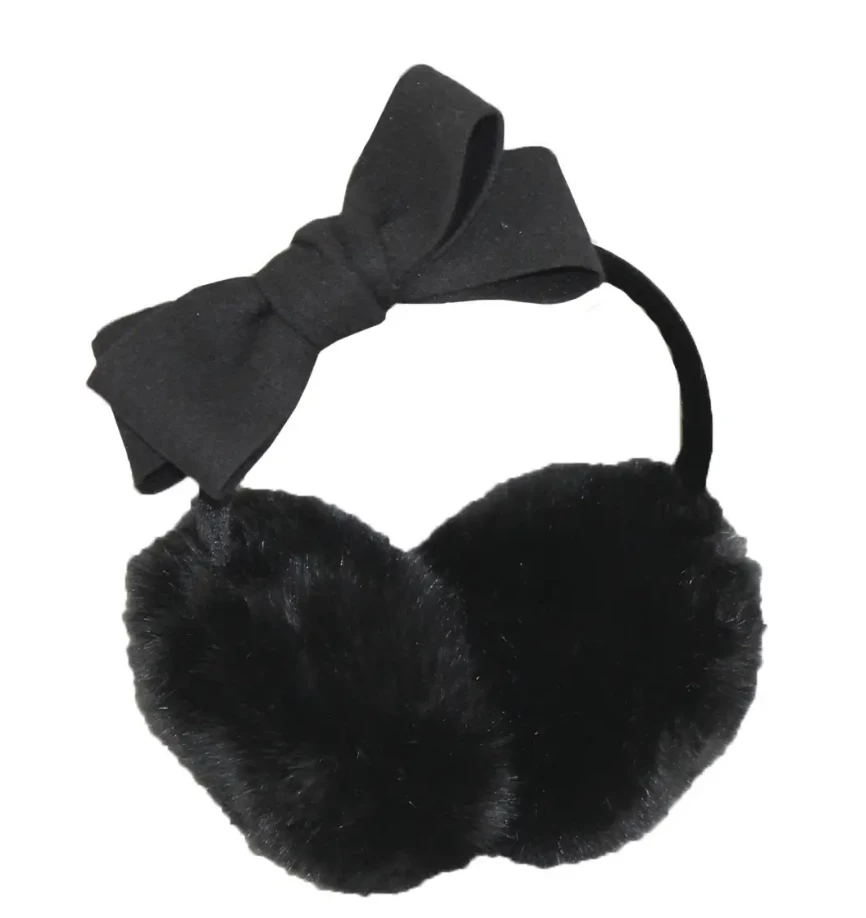 Fuzzy black faux fur earmuffs with black velvet covered adjustable band and black felted fabric bow –a cute and cozy classic for blustery days!