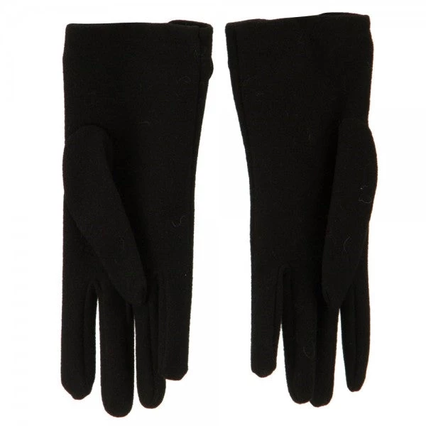 Black brushed fiber stretch gloves with ornamental black cording button & loop “frog” fastener at the wrist. These classic design lightweight gloves are the perfect amount of coziness for most chilly days and easily accessorize retro or modern ensembles.