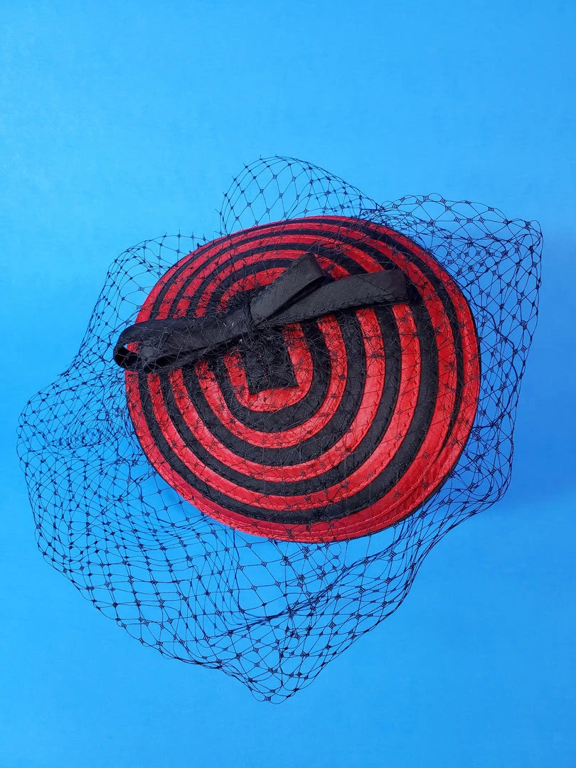 Black and red spiral swirl fascinator with black bow and netting on a satin covered headband –very glamorous with a bit of Dark Circus-y whimsy for good measure!