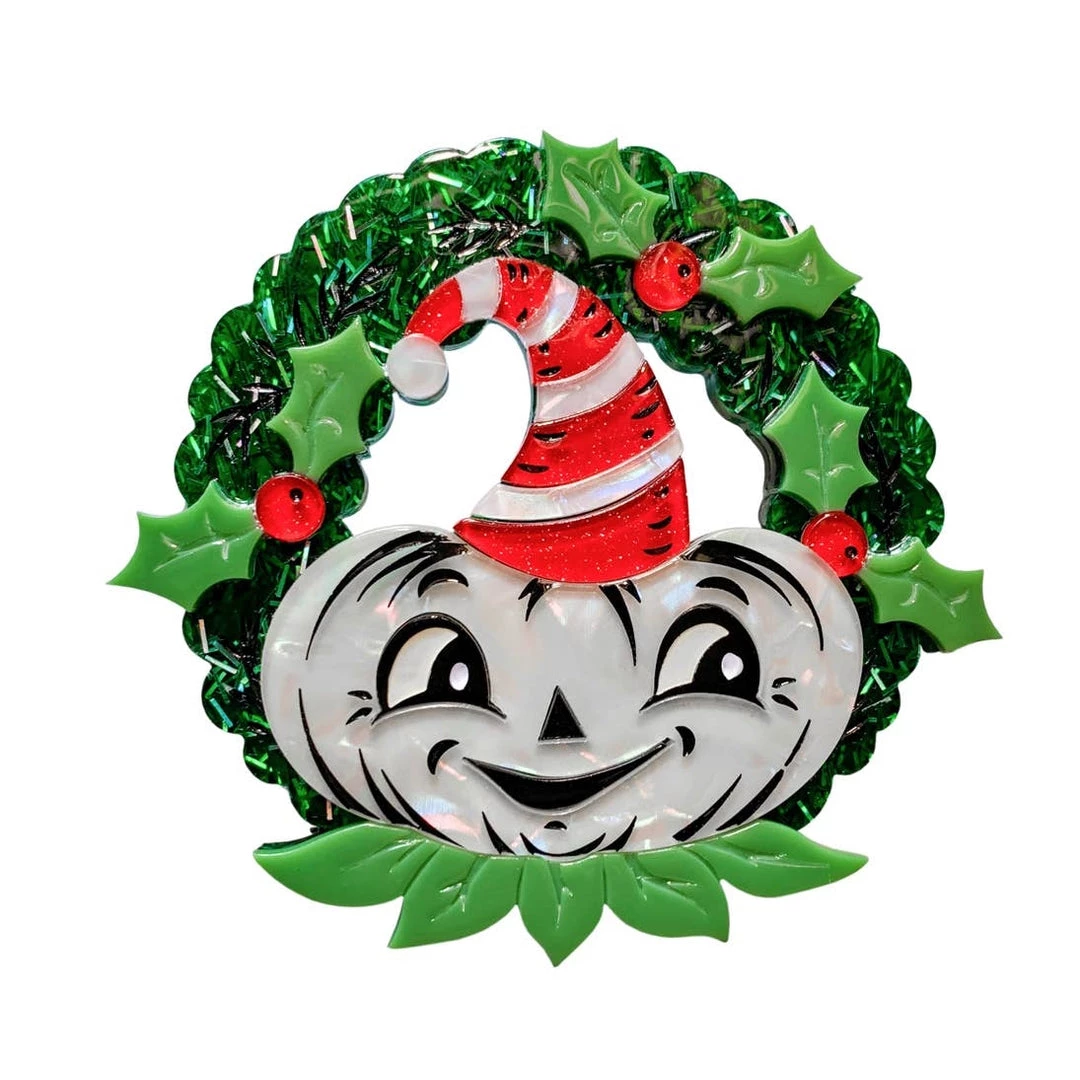 Lipstick & Chrome x Johanna Parker Chrismaween Collection “Jolly Jack” festive smiling white pumpkin and holly decorated wreath layered laser cut resin brooch