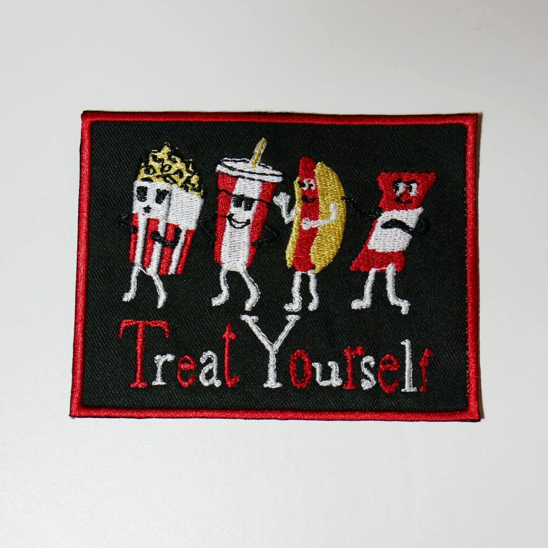 Let’s all go to the lobby!… Classic movie theater snack bar treats on a black canvas patch with red border. Designed and made in Oregon by Junkyard Witch.