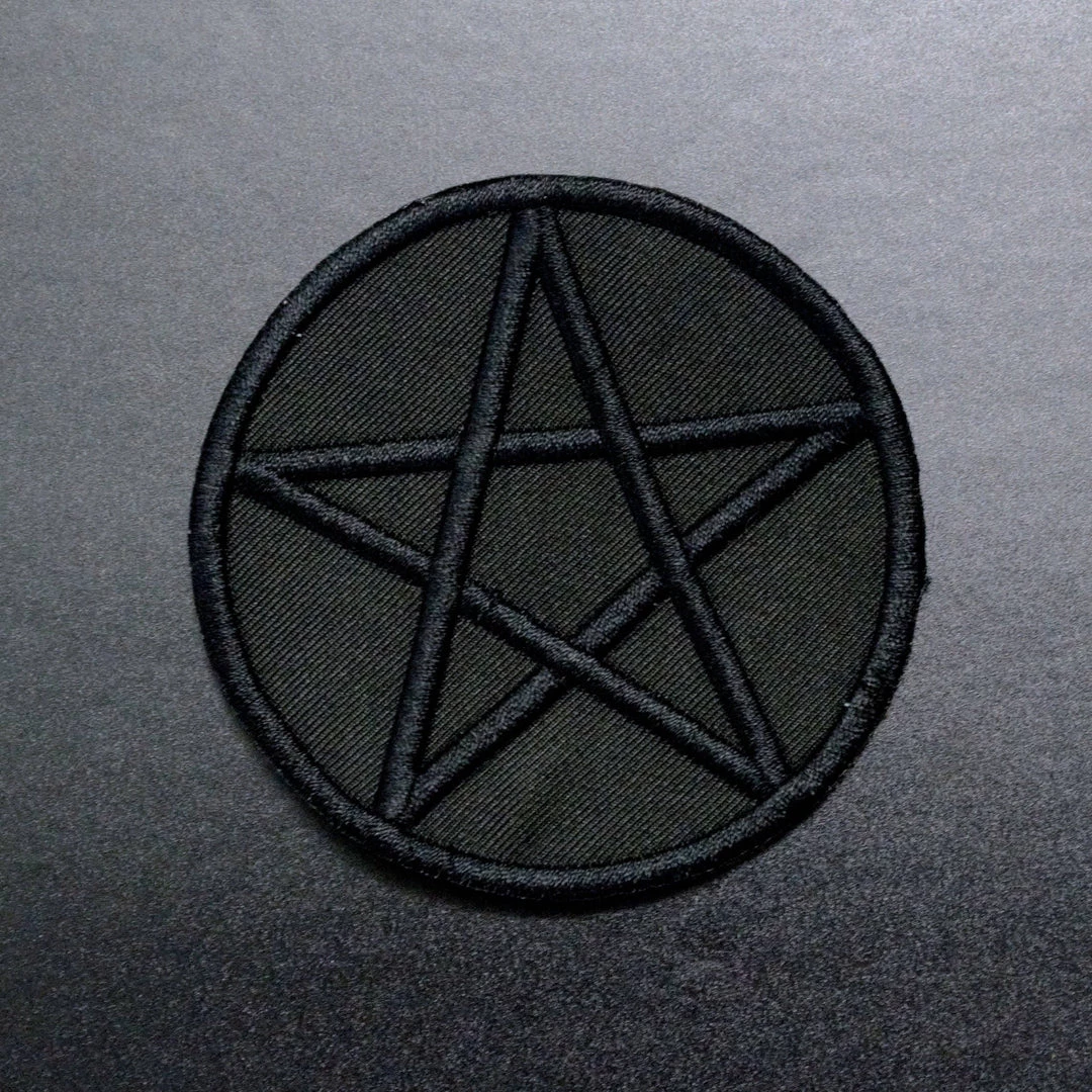 3″ round black embroidery on black canvas Pentagram patch. Designed and made in Oregon by Junkyard Witch.