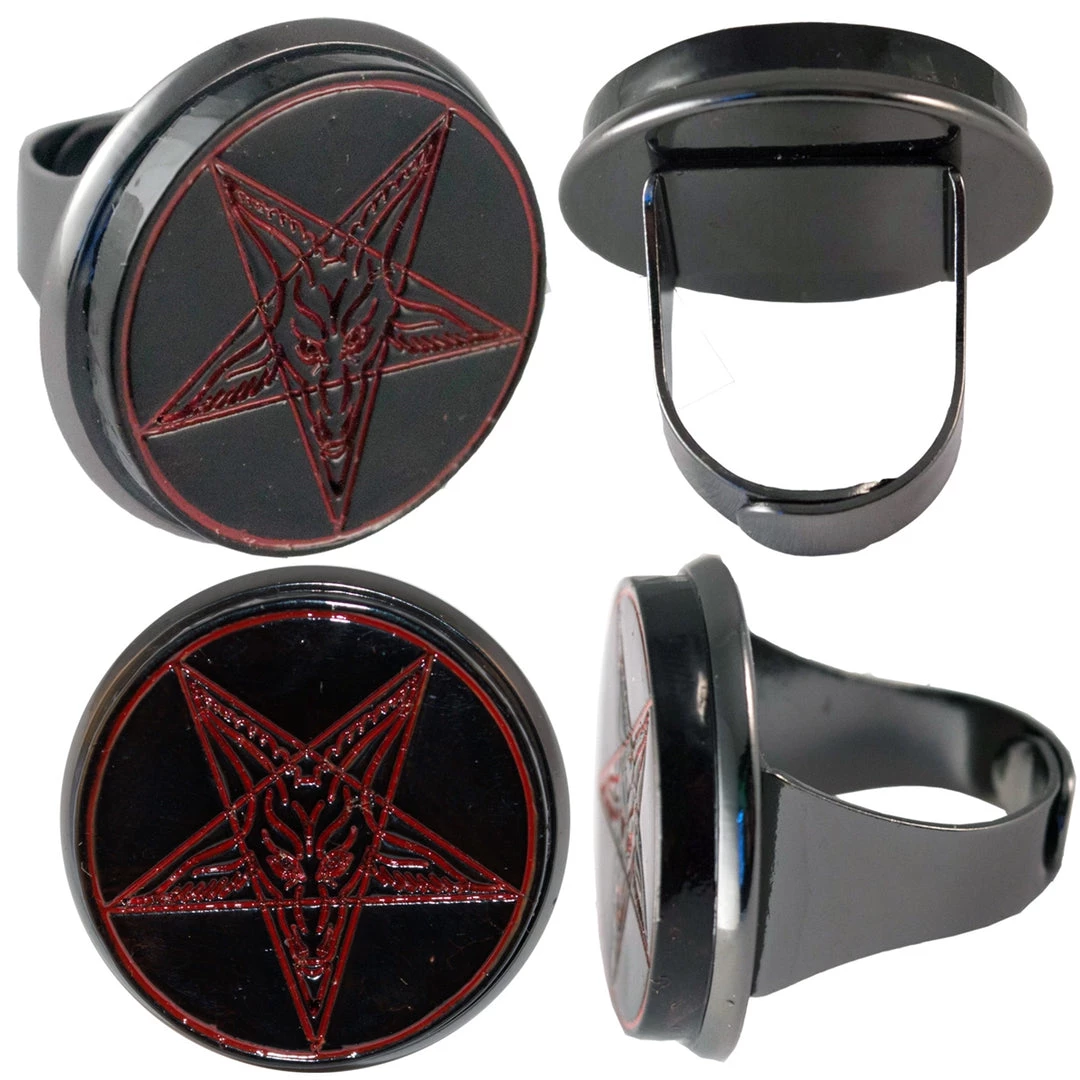Nicely detailed black and red metal Baphomet 1 1/8″ round ring on wide gunmetal adjustable band. Made by Kreepsville 666