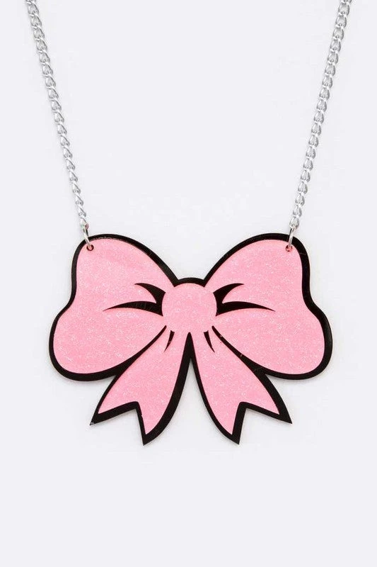 Pretty glitter pink and black layered laser-cut acrylic bow pendant on 20″ silver metal chain with lobster claw clasp.