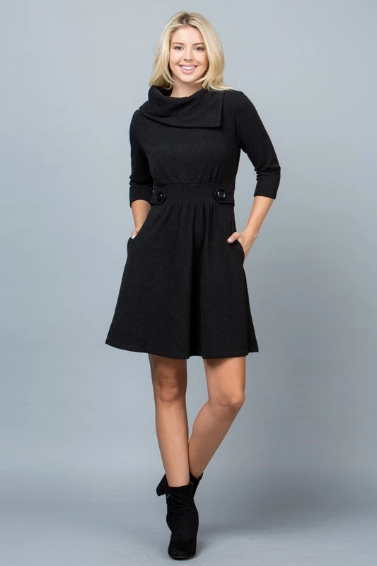 Sweet and cozy black Hacci sweater knit 3/4 sleeve flared dress with button detail banded waist, wide asymmetrical collar (perfect for showing off brooches!) in a fun above the knee length –and pockets!