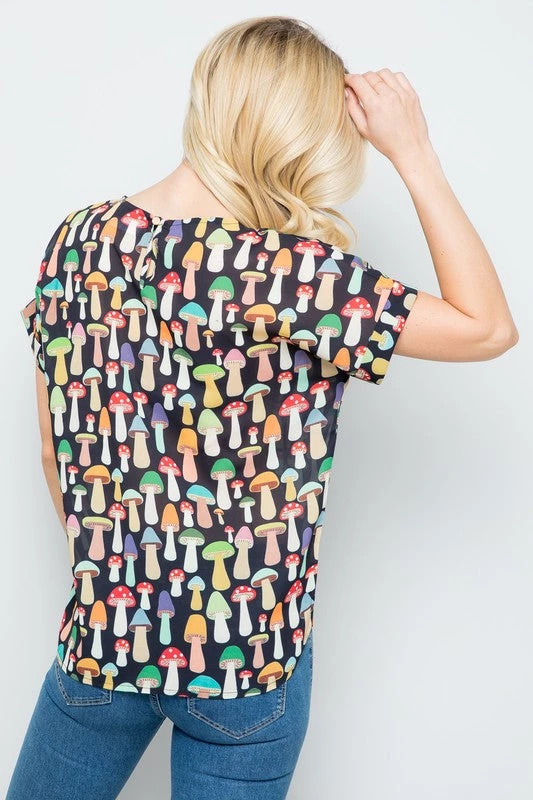 So fun(gi)! Black background allover assorted toadstool mushrooms print relaxed fit crew neckline top featuring keyhole button closure at the nape, cuff detail short sleeves, curved bottom hem, and a length that’s great for tucking in or wearing loose.