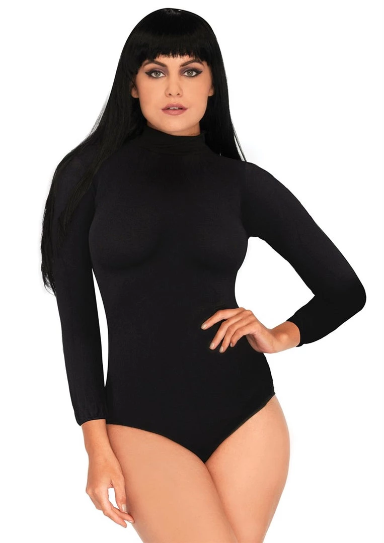 Black stretch mock turtleneck 3/4 sleeve bodysuit with snap crotch closure–a great piece to use as a base for many different costumes, or as a sleek look for everyday wear.
