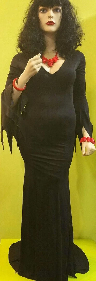 Floor Length Gothic Dress with back zipper and mid-thigh right front slit by Leg Avenue. Dress is truly floor length. When we have the M/L on our 5’11” (in heels) size 12 (42″-33″-43″) mannequin (see last photo), it meets the floor in front and has about 8″ on train pooling behind her –very Morticia…or Vampira…or Elvira…