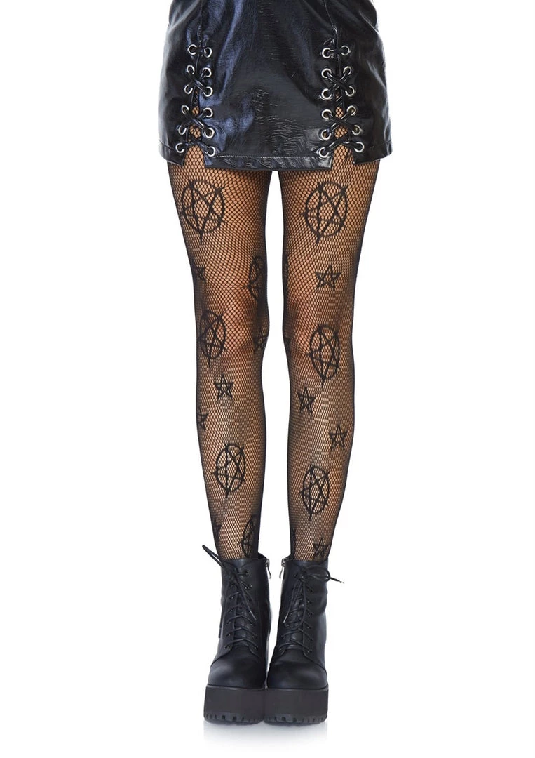 Black fishnet pantyhose with allover woven-in pentagram and pentacle pattern