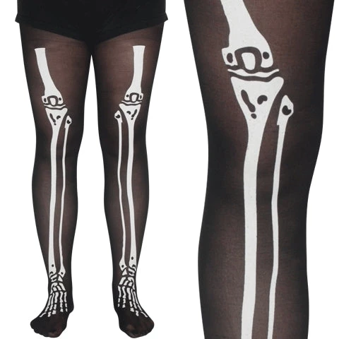 Opaque black nylon tights with printed white skeleton bones print on the front –just like the only-available-at-Halloween-time tights of my 80s teen years…ah, the nostalgia!