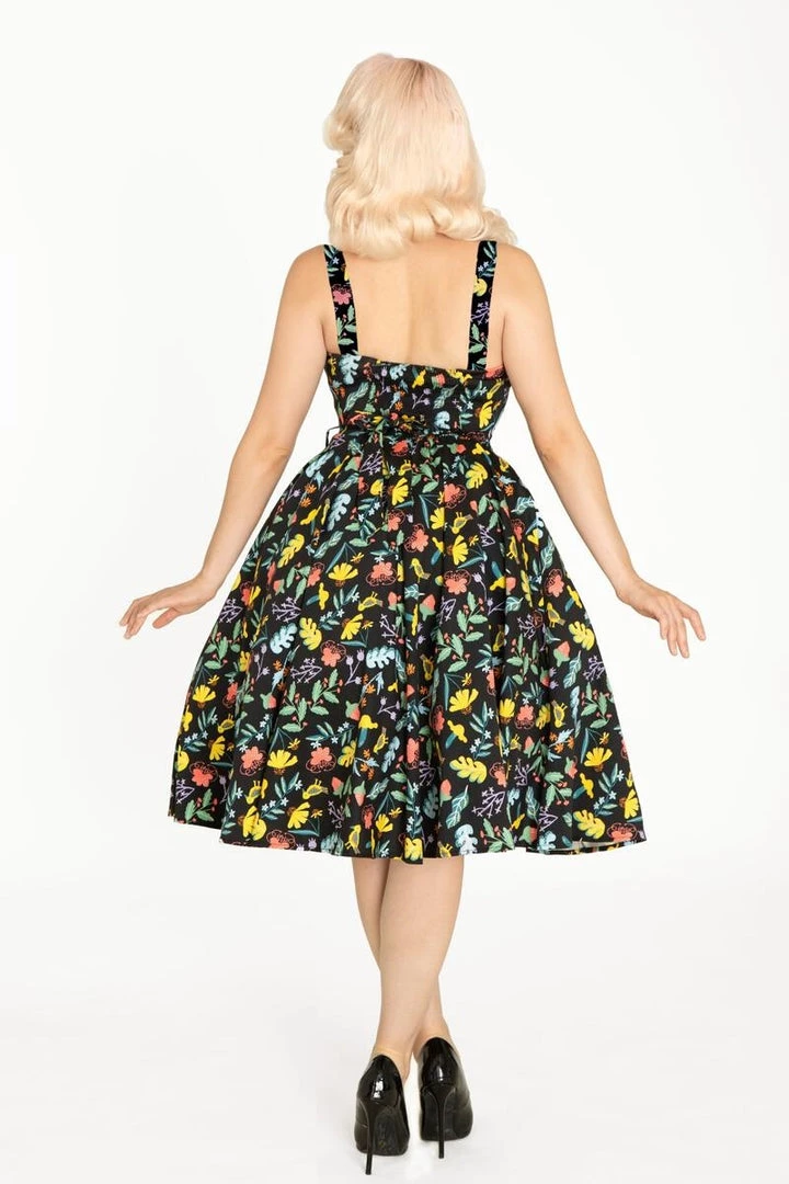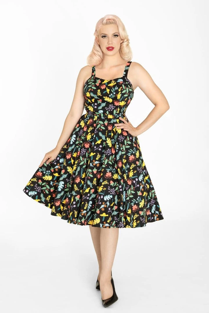 So pretty! “Folk Garden” black background flower, berry, bird, mushroom, and leaf print dress from Miss Lulo –this beauty features a fitted sweetheart neckline princess seamed bodice with adjustable button fastener straps (2 1/2″ leeway), removable self sash belt, swingy gathered full circle just below the knee length skirt…and pockets! (shown here with a crinoline for extra oomph)