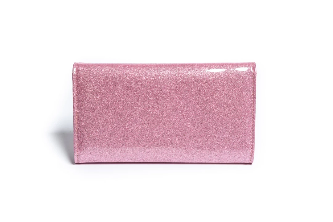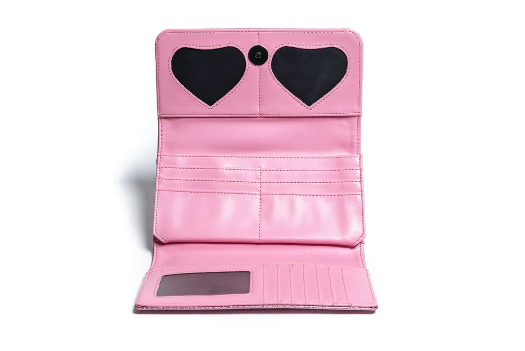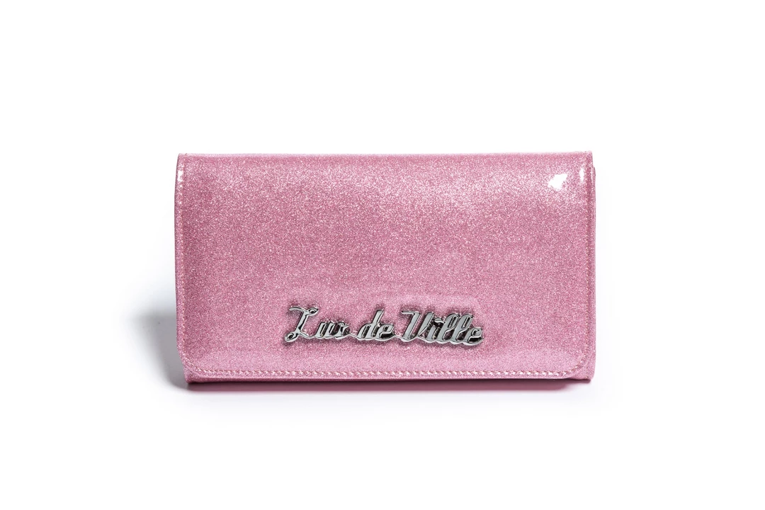 Bashful Blush Sparkle “Lady Lux” tri-fold wallet with pink matte interior featuring zipper coin pouch, lots of card slots, heart shape photo windows, and finished with a reliable magnetic snap closure. Made by Lux De Ville.