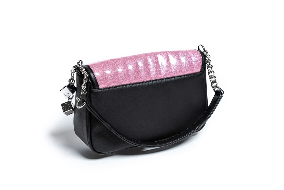 Mini Gambler Tote by Lux De Ville, featuring channel stitched Bashful Blush pink sparkle vinyl front flap with magnetic two-snap closure, black matte body, shiny silver metal hardware, and a detachable silver metal card suit dice bauble. Interior is lined with black on black diamond pattern fabric and has a zip closure pocket.