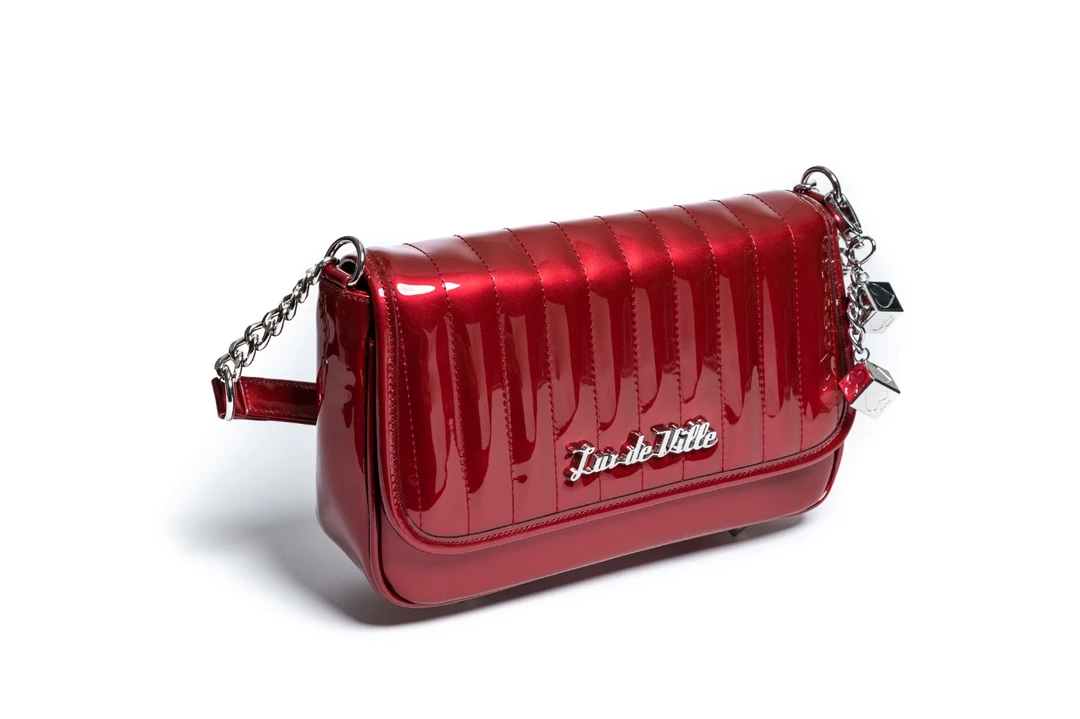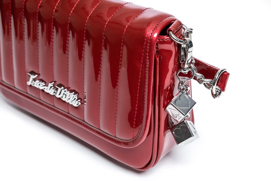 Mini Gambler Tote by Lux De Ville, featuring deep, rich Red Shiny vinyl body & channel stitched front flap with magnetic two-snap closure, shiny silver metal hardware, and a detachable silver metal card suit dice bauble. Interior is lined with black on black diamond pattern fabric and has a zip closure pocket.