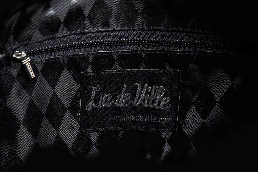 Blast Off Tote by Lux De Ville, featuring channel stitched Sonic Silver sparkle vinyl front and back panels, black matte body and straps, shiny silver metal hardware, and a detachable silver metal rocket ship bauble. Interior is lined with black on black diamond pattern fabric and has a zip closure pocket.