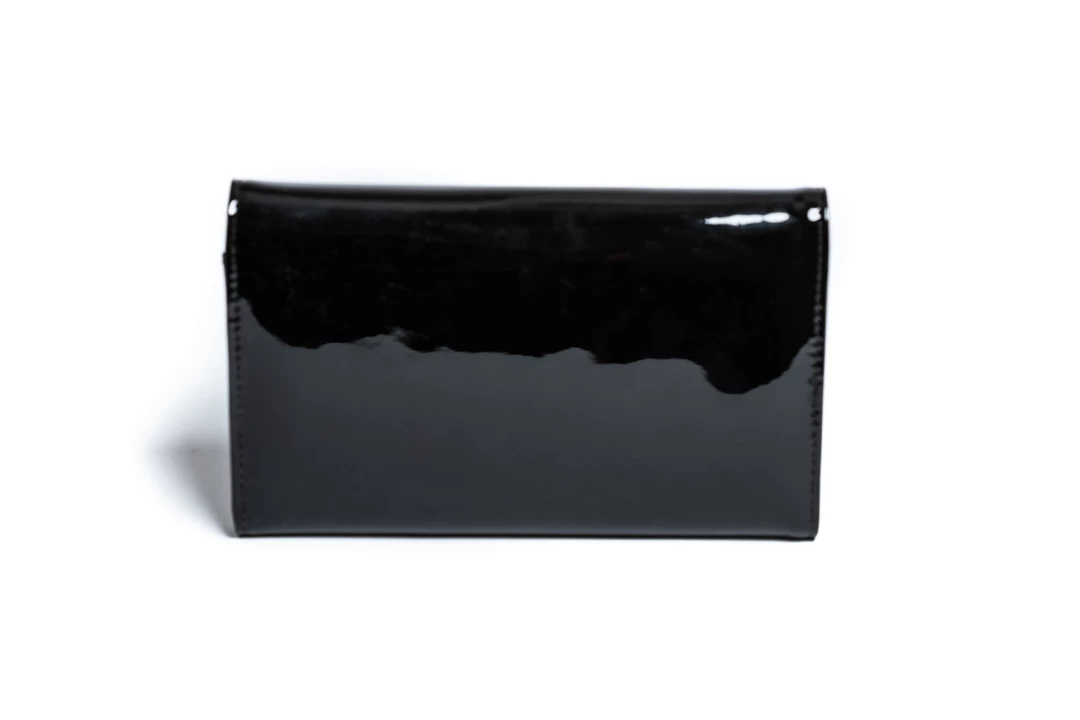 Shiny, shiny black “Lady Lux” tri-fold wallet with black matte interior featuring zipper coin pouch, lots of card slots, heart shape photo windows, and finished with a reliable magnetic snap closure. Made by Lux De Ville.