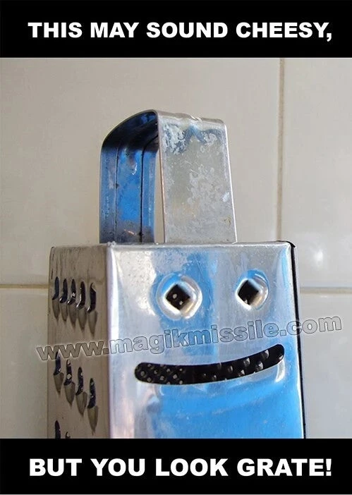 “This may sound cheesy, but you look grate!” –kind of a groaner, but that smiley grater sure is cute 🙂