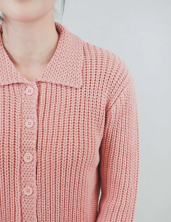 Retro-style chunky knit cardigan in warm dusty pink with contrast texture pointed collar and 3/4 sleeves in a slightly cropped length that’s perfect for pairing with high-waisted favorites –adorable!