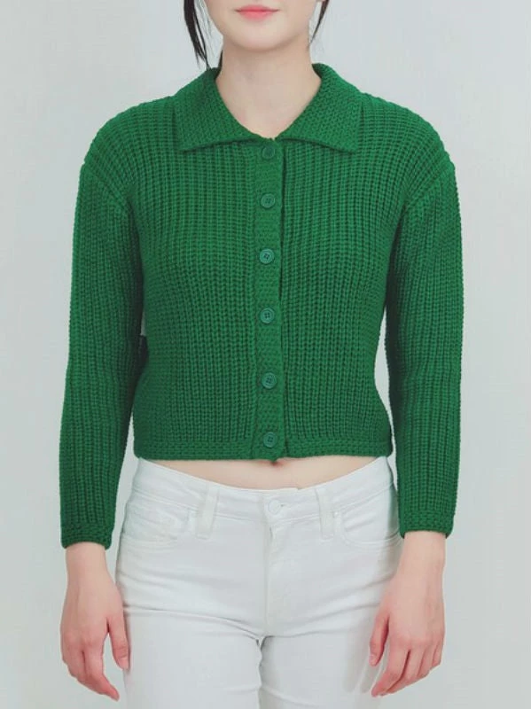 Retro-style kelly green chunky knit cardigan with contrast texture pointed collar and 3/4 sleeves in a slightly cropped length that’s perfect for pairing with high-waisted favorites –adorable!