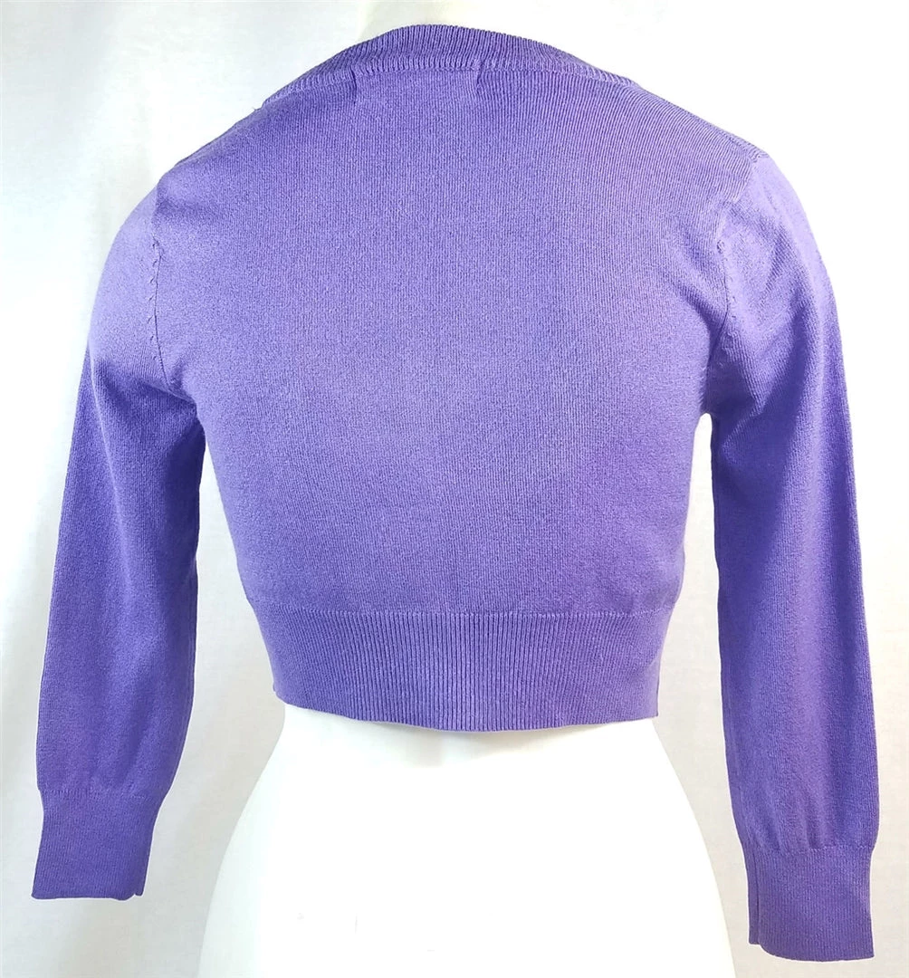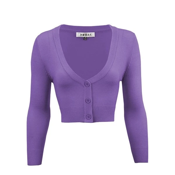 Super soft 3/4 sleeve v-neck cropped cardigan in light purple “Blueberry” color. Great with dresses and high-waist bottoms!