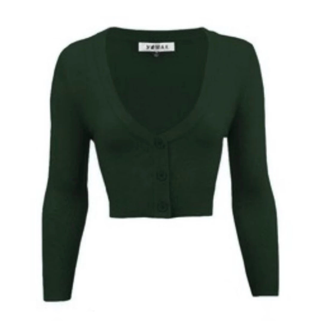 This perfect cropped cardigan sweater in rich hunter green by MAK with flattering v-neck, 3/4 sleeves and three-button closure is just the thing to pair with your breezy vintage dresses and high-waisted bottoms.