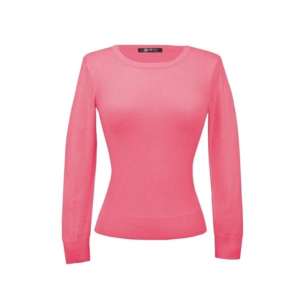 Super soft fitted pretty pink pullover in a slightly cropped length with crew neck and 3/4 sleeves, reminiscent the “sweater girl” styles of the 50s –perfect for pairing with your high-waisted favorites!