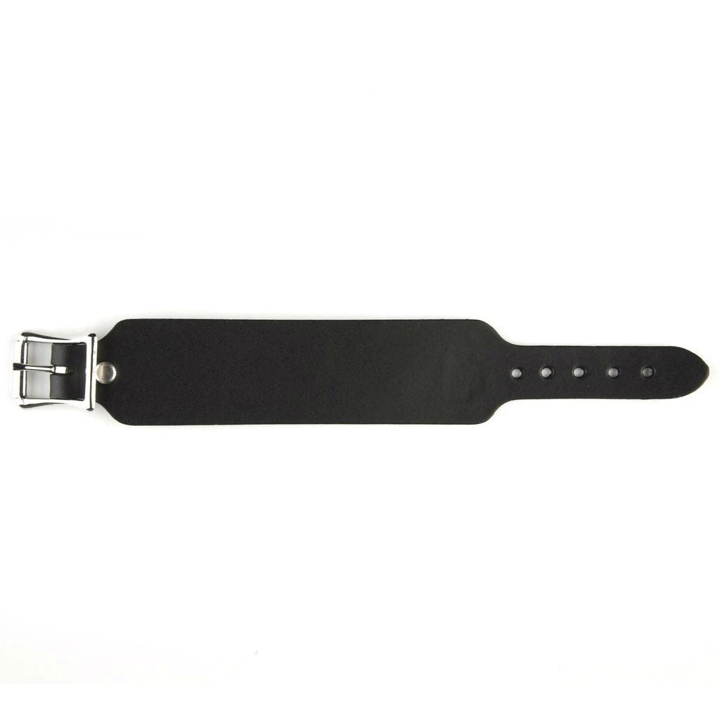 Classic thick black leather 1 1/2″ wide adjustable cuff with silver metal buckle closure. This stiff and sturdy bracelet will break in nicely and last for years. Made in the U.S.A. by Mascorro Leather.