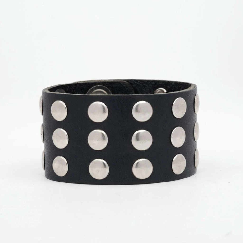 Classic thick leather 1 5/8″ wide adjustable studded cuff with 3 rows of 3/8″ round silver metal rivets and heavy duty snap closure. This stiff and sturdy bracelet will break in nicely and last for years. Made in the U.S.A. by Mascorro Leather.