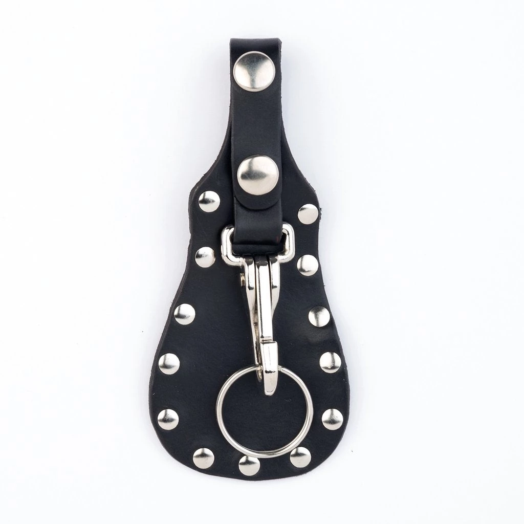 Fancy rivet studded sturdy black leather snap on keychain fob with heavy duty hook