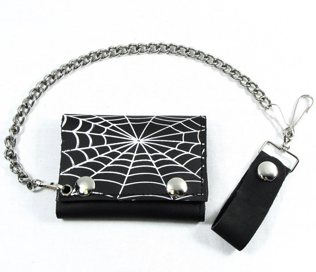 The classic tri-fold chain wallet, in black with spiderweb design in white
