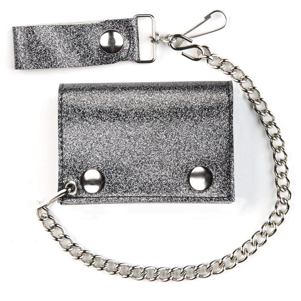 Classic tri-fold chain wallet in soft and durable charcoal grey glitter vinyl