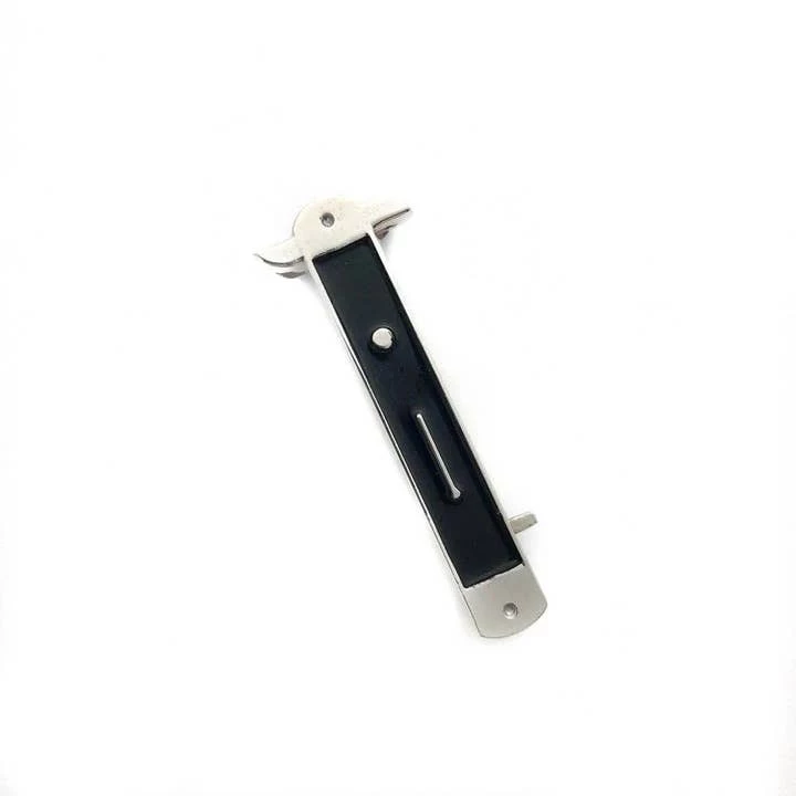 Shiny silver metal and black enamel switchblade stiletto knife lapel pin…with side lever controlled telescoping blade –neato! Made by Memento Mori Goods