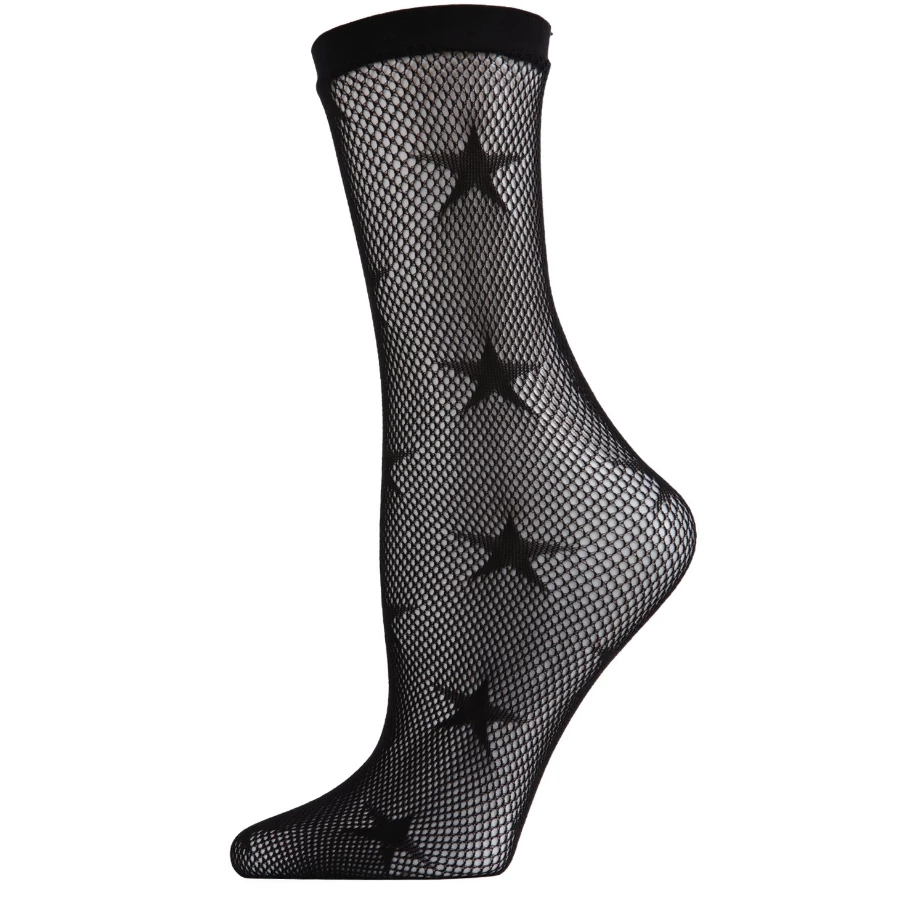 Soft and stretchy black net crew length sock with allover knit-in star pattern and 7/8″ wide top band –cute with flats, heels, or peeking out of boots 🙂