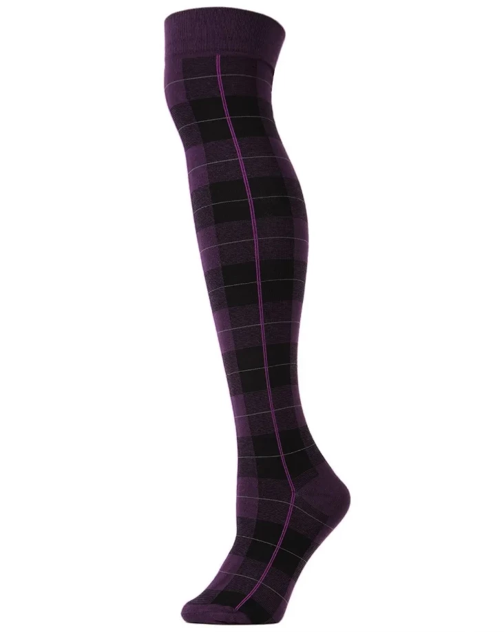 Cozy over-the-knee length socks with comfy contoured foot in a purple background plaid with black, magenta, and grey.