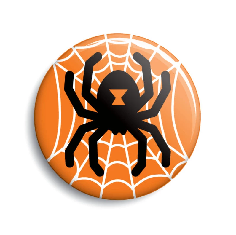 Retro-Halloween style illustrated black widow spider in her web against orange background 1 1/2″ round metal pin-back button, made in the U.S.A. by Monsterologist