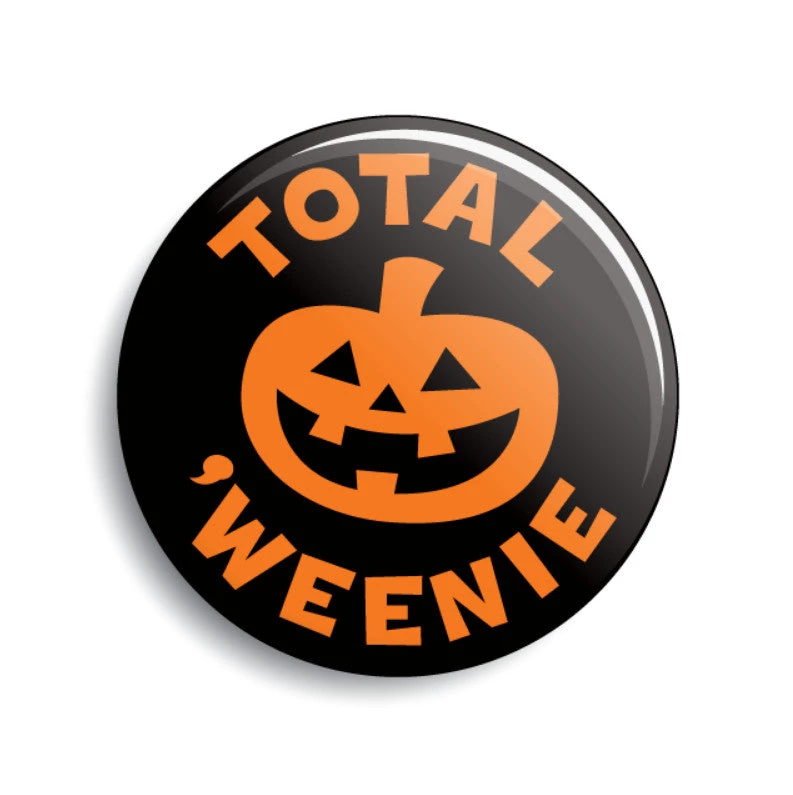 Perfect for Halloween-all-the-time enthusiasts! “TOTAL ‘WEENIE” illustrated orange jack-o’-lantern against black background 1 1/2″ round metal pin-back button, made in the U.S.A. by Monsterologist