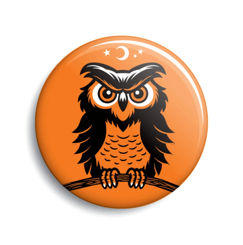 Retro-Halloween style illustrated black & orange owl against orange background 1 1/2″ round metal pin-back button, made in the U.S.A. by Monsterologist