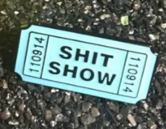 Step Right Up–get your ticket to the “Shit Show!” Classic blue carnival ticket-shaped hard enamel black metal pin
