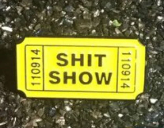 Step right up–get your ticket to the “Shit Show!” Bright yellow glow-in-the-dark soft enamel black metal pin