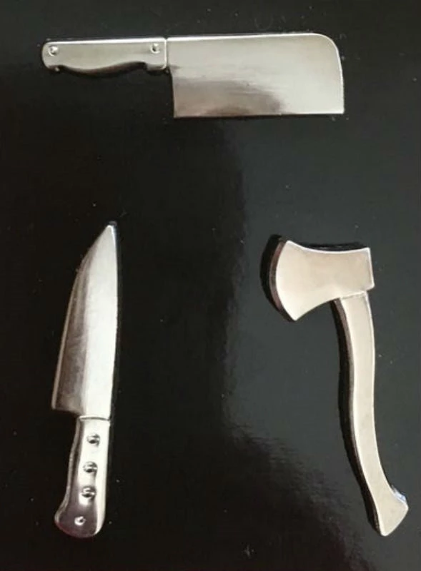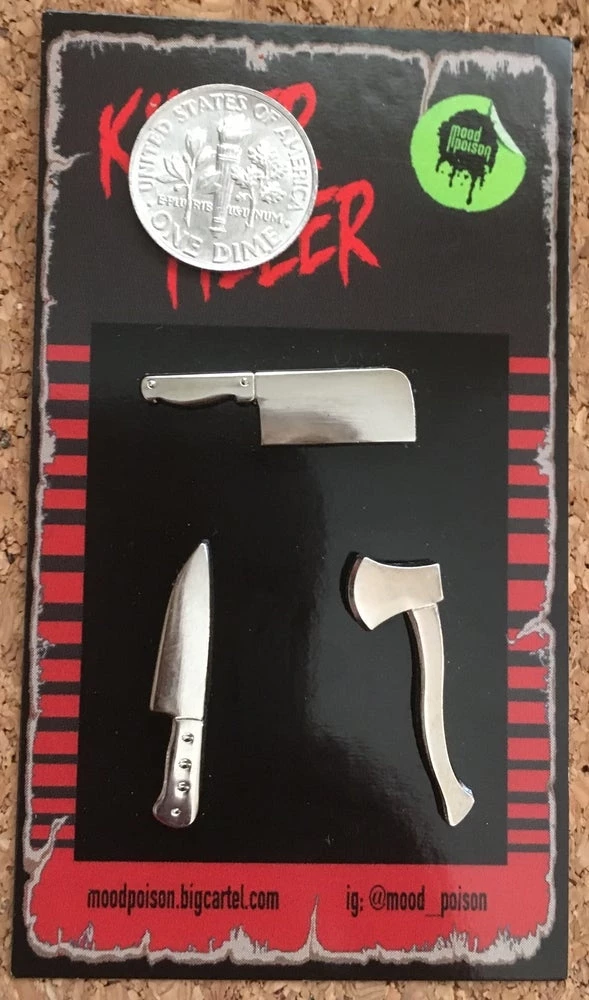 Tiny (so of course cute) & Deadly! “Killer Filler” set of three 1″ shiny silver metal micro clutch-back fastener pins –set contains 1 cleaver, 1 chef knife & 1 hatchet. Made by Mood Poison.