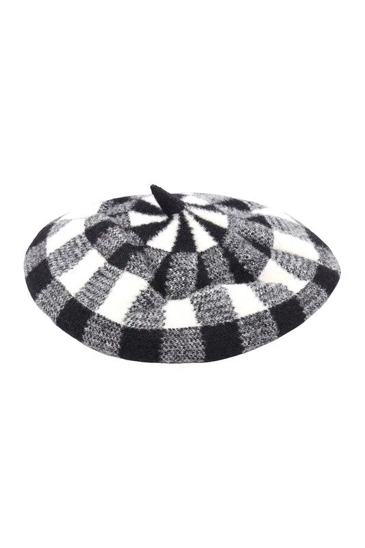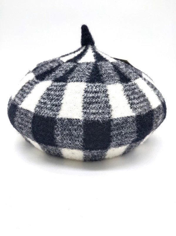 Thick and cozy jacquard knit black & white Buffalo check plaid “French” beret with adjustable band –a sweet way to top off vintage or modern outfits!