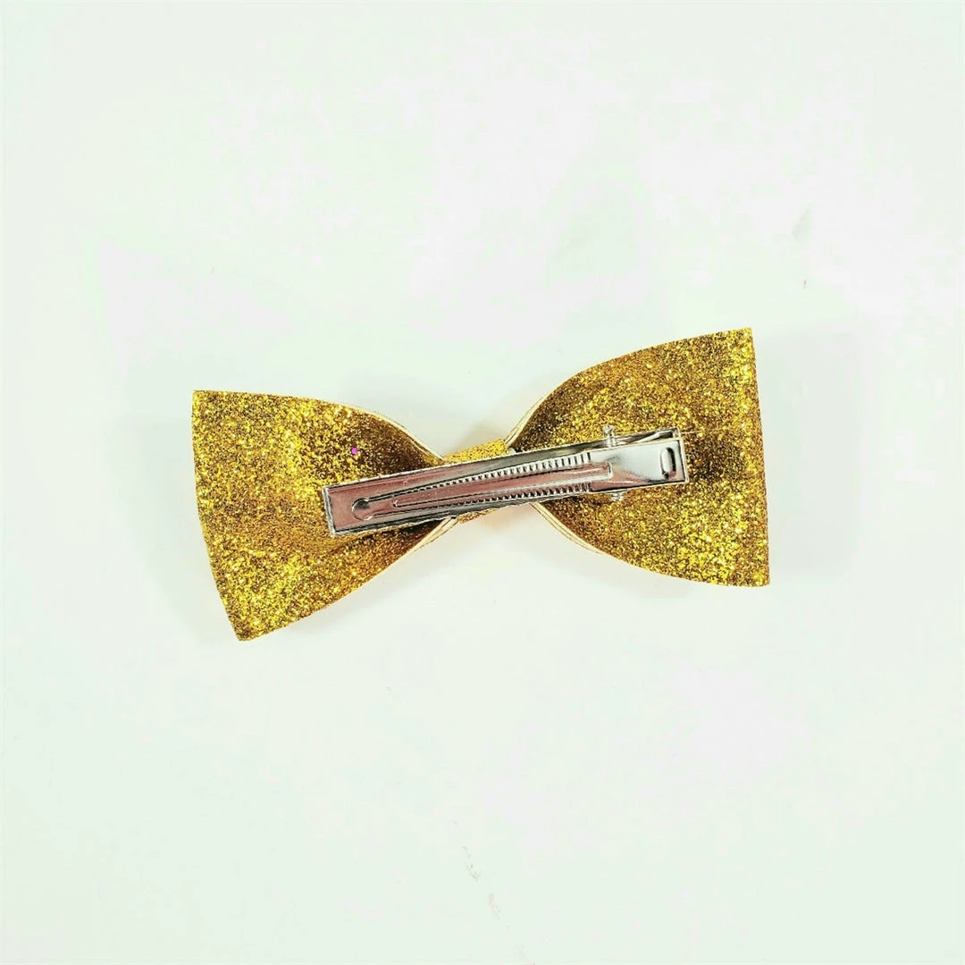 Cute bow hair clip in shimmery gold glitter encrusted stiff fabric that really catch the light!