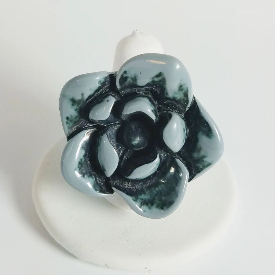 Boldly shaped grey flower plastic ring with rich black shadowing–very striking